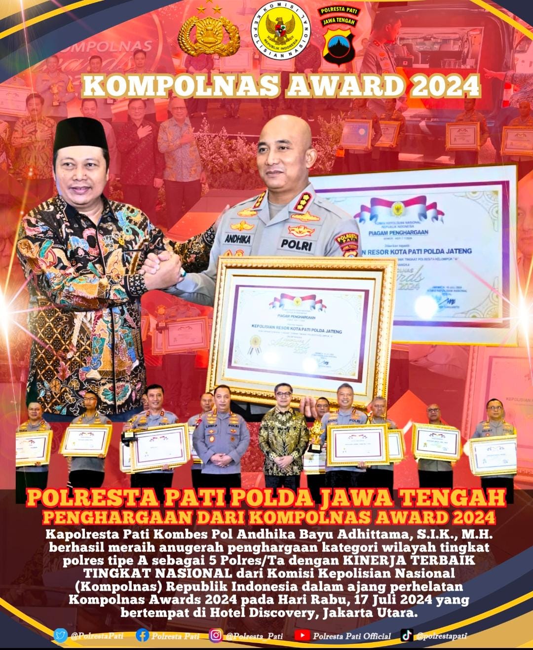 – Malam penganugerahan Komisi Kepolisian Nasional (Kompolnas) Awards 2024 sukses digelar. Penghargaan diberikan kepada setiap kelompok dari tingkat Mabes hingga Polsek. Salah satunya adalah Polresta Pati.
