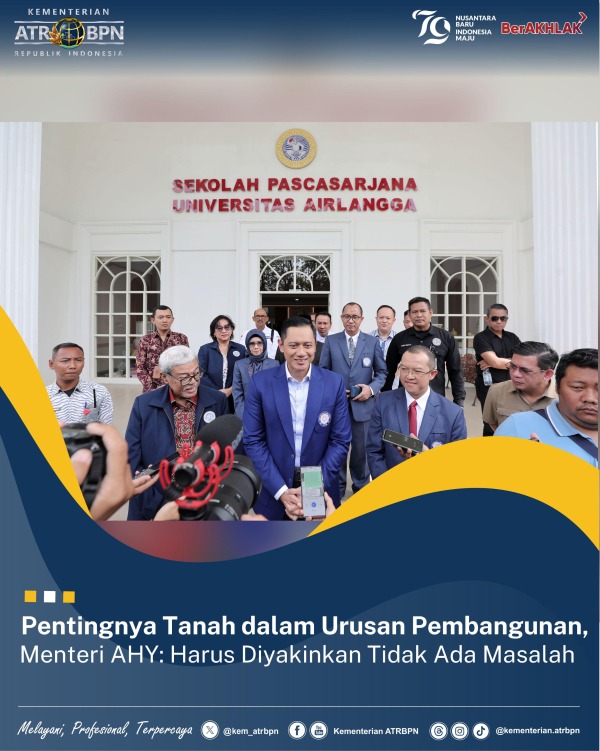 “Mengapa tanah penting? Karena salah satu faktor produksi dan kita membutuhkan tanah dalam berbagai pembangunan, maka harus diyakinkan bahwa tanah tidak ada masalah, tata ruangnya jelas,” kata Menteri ATR/Kepala BPN, Agus Harimurti Yudhoyono (AHY) usai melakukan Ujian Kelayakan pada Program Doktor Pengembangan Sumber Daya Manusia, yang berlangsung di Universitas Airlangga Surabaya, Kamis (22/08/2024).