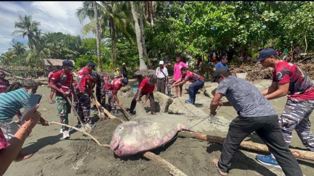 Bertempat di Pantai Sembor Kalibobo, Kab. Nabire. Komandan Lanal Nabire Letkol Laut (P) Pius Herdasa Krisna Murti, S.T, M.T, CBEI, CACA, CRMP, CHRMP., memimpin proses evakuasi Ikan Mola-mola yang terdampar. Jumat (30/08/24).