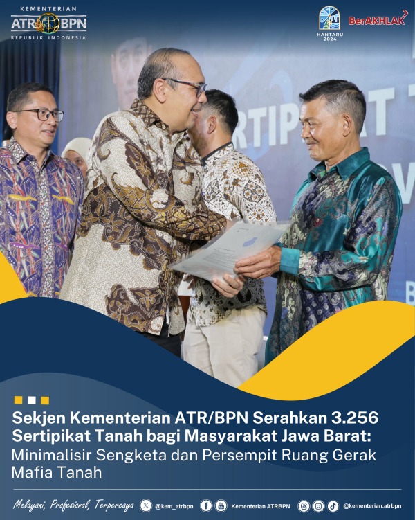 Sertipikat yang diserahkan kali ini berasal dari program Pendaftaran Tanah Sistematis Lengkap (PTSL) dan Redistribusi Tanah yang dilaksanakan di berbagai kabupaten/kota di Jawa Barat. “Dengan diterimanya sertipikat tentunya akan meminimalisir sengketa dan mengurangi ruang gerak mafia tanah,” kata Sekjen dalam sambutannya.