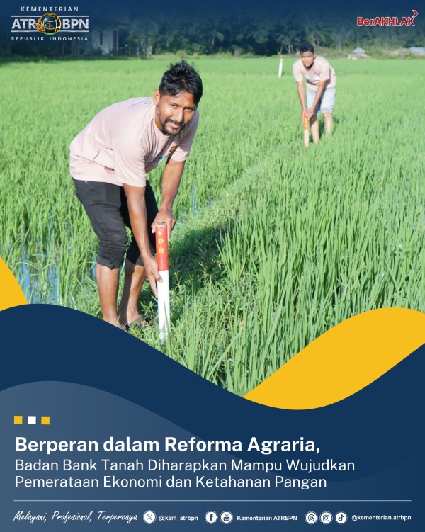 Jakarta,CNN Indonesia.id – Kementerian Agraria dan Tata Ruang/Badan Pertanahan Nasional (ATR/BPN) mendorong Badan Bank Tanah untuk bersama-sama melaksanakan Reforma Agraria yang bertujuan memberikan keadilan, pemerataan ekonomi, hingga ketahanan pangan. Hal ini disampaikan oleh Sekretaris Jenderal (Sekjen) Kementerian ATR/BPN, Suyus Windayana dalam Focus Group Discussion (FGD) “Program Pengembangan Reforma Agraria Badan Bank Tanah” yang berlangsung di Mandarin Oriental Hotel, Jakarta, Kamis (24/10/2024).