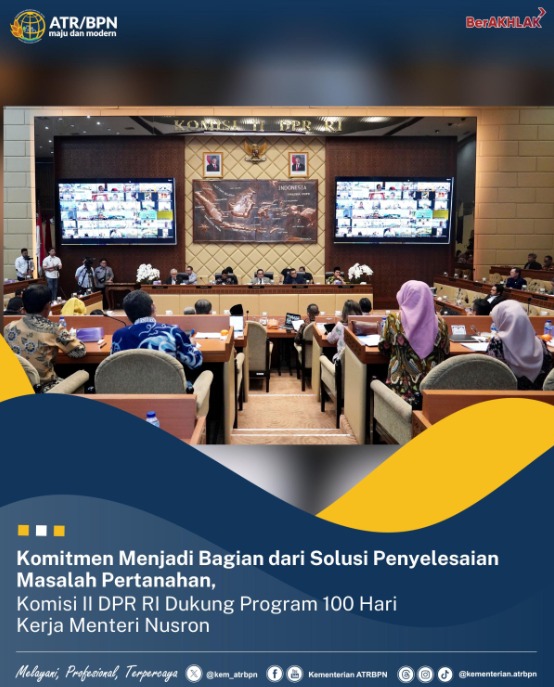 Jakarta,CNN Indonesia.id- Menteri Agraria dan Tata Ruang/Kepala Badan Pertanahan Nasional (ATR/BPN), Nusron Wahid menyampaikan Program 100 Hari Kerjanya dalam Kabinet Merah Putih di hadapan Pimpinan dan Anggota Komisi II Dewan Perwakilan Rakyat Republik Indonesia (DPR RI) dalam Rapat Kerja di Gedung Nusantara II, Rabu (30/10/1024). Sedikitnya, terdapat sembilan program kerja yang akan difokuskan guna menyelesaikan masalah pertanahan di Indonesia.
