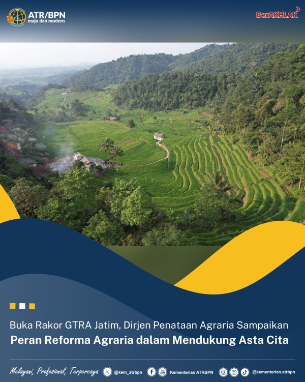 Dalam kegiatan ini, turut hadir Kepala Kantor Wilayah (Kanwil) BPN Provinsi Jawa Timur yang juga merupakan Ketua Pelaksana Harian GTRA Provinsi Jawa Timur, Lampri. Ia berharap, melalui Rapat Koordinasi Tim GTRA Provinsi Jawa Timur ini dapat bersama mewujudkan misi Asta Cita 2024/2029.