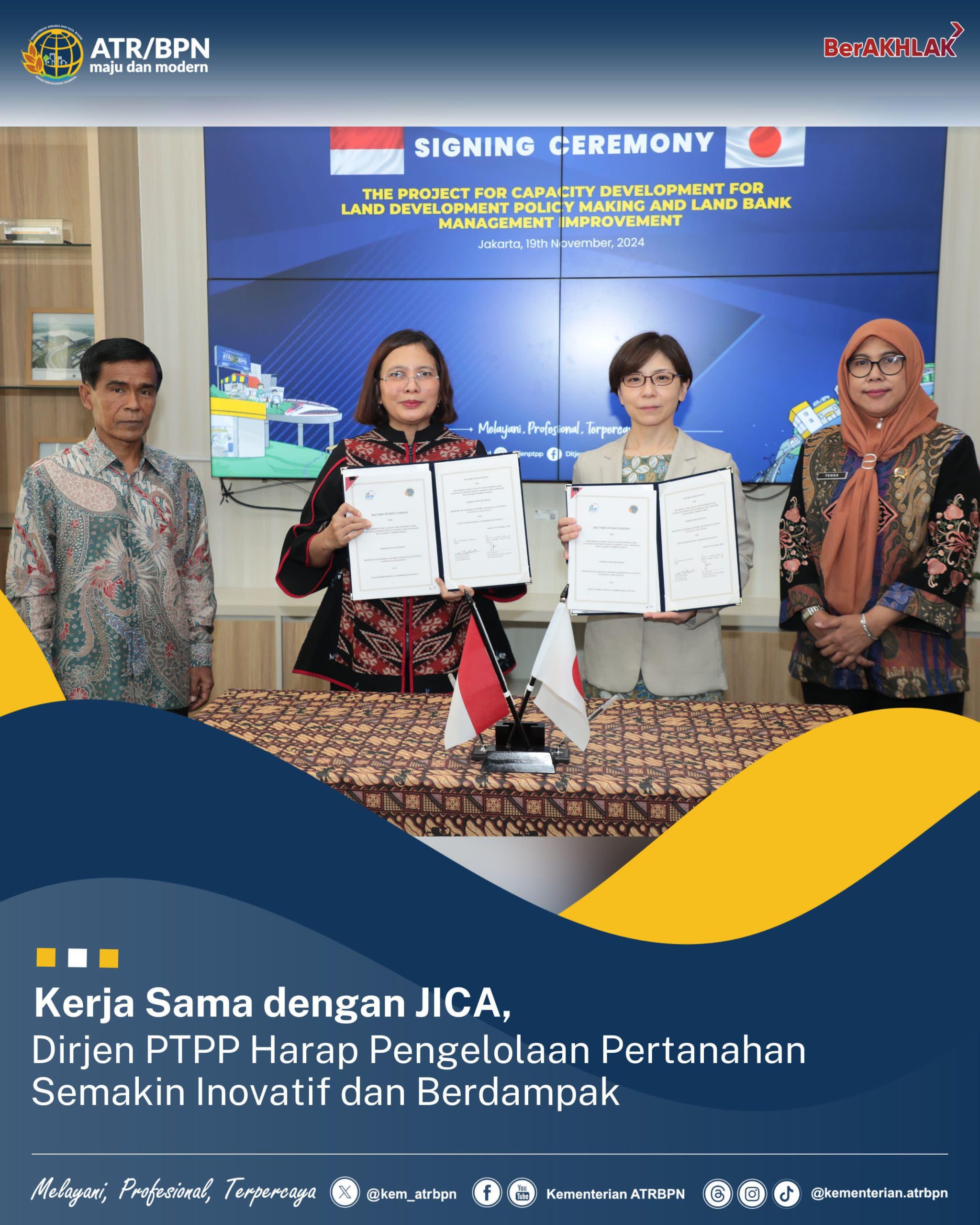 Melalui kerja sama antara Kementerian ATR/BPN dengan JICA diharapkan dapat menumbuhkan budaya unggul dan inovasi dalam mengembangkan pengelolaan tanah dengan memaksimlkan pemanfaatannya untuk kepentingan rakyat.