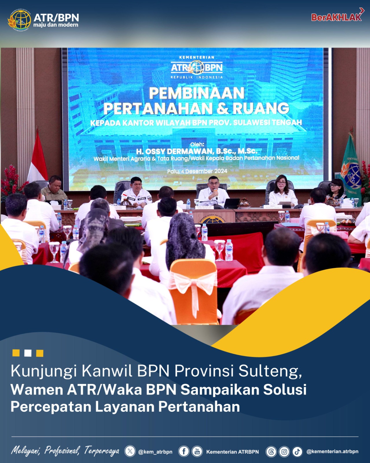 Palu,CNN Indonesia.id – Wakil Menteri Agraria dan Tata Ruang/Wakil Kepala Badan Pertanahan Nasional (Wamen ATR/Waka BPN), Ossy Dermawan mengemukakan solusi dalam rangka percepatan layanan publik di lingkungan Kementerian ATR/BPN. Hal ini ia sampaikan ketika berkunjung ke Kantor Wilayah (Kanwil) BPN Provinsi Sulawesi Tengah (Sulteng), Kota Palu pada Rabu (04/12/2024).