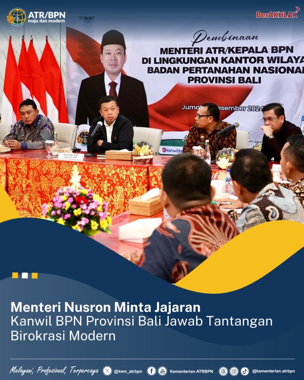 “Kelima, transparan, bisa dikontrol oleh masyarakat. Kita harus menjadi birokrasi yang modern,” imbau Menteri Nusron kepada jajarannya di Kanwil BPN Provinsi Bali.