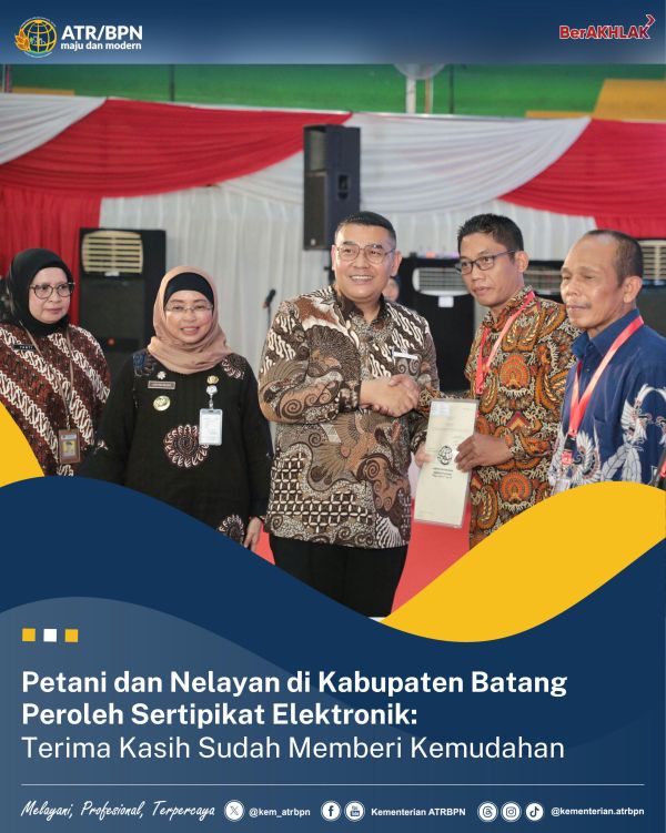 Dalam kegiatan ini, Wakil Menteri ATR/Wakil Kepala BPN, Ossy Dermawan menyerahkan sebanyak 1.571 Sertipikat Elektronik dengan didampingi oleh Plt. Kepala Kantor Wilayah (Kanwil) BPN Provinsi Jawa Tengah, Sri Yanti Achmad dan Pj. Bupati Batang, Lani Dwi Rejeki. Kegiatan ini juga dihadiri oleh Bupati Batang terpilih, M. Faiz Kurniawan dan juga perwakilan Forkopimda Provinsi Jawa Tengah beserta jajaran. (AR/MW)