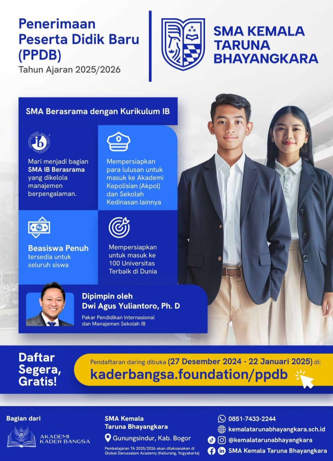 JAKARTA, CNN Indonesia.id – Pada Jumat (28/12/2014), tepat pukul 10.00 WIB, telah dibuka secara resmi Penerimaan Peserta Didik Baru (PPDB) SMA Kemala Taruna Bhayangkara, yang diperuntukkan bagi para siswa-siswi SMP berprestasi yang diprioritaskan bagi siswa kurang beruntung secara ekonomi, dari seluruh nusantara, untuk melanjutkan pendidikan ke sekolah berkualitas secara gratis.