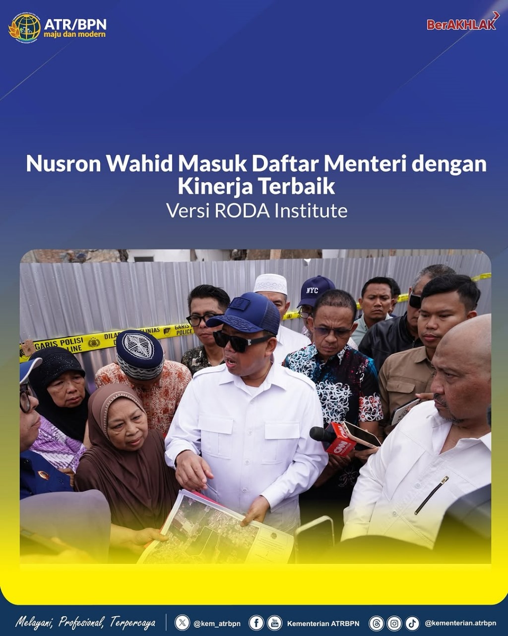 Jakarta – Menteri Agraria dan Tata Ruang/Kepala Badan Pertanahan Nasional (ATR/BPN), Nusron Wahid, dikategorikan sebagai lima Menteri Kabinet Merah Putih dengan kinerja terbaik berdasarkan hasil riset dari Research Oriented Development Analysis (RODA) Institute. Riset ini secara resmi dirilis pada Rabu (19/02/2025) lalu.