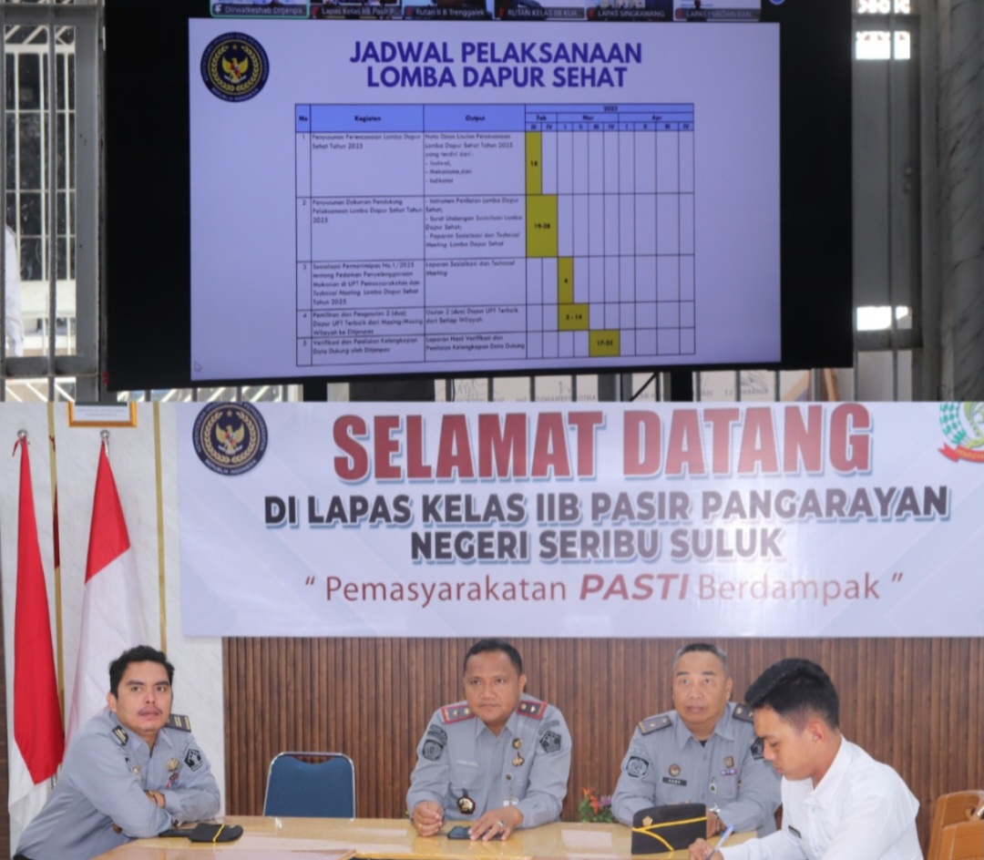 Pasir Pangarayan, CNN Indonesia.id – Kepala Lembaga Pemasyarakatan Kelas IIB Pasir Pangarayan, Efendi P Purba bersama Kasi Binadik dan Giatja Sunu Istiqomah Danu dan Kasubsi Perawatan, Ariyono beserta staf ikuti sosialisasi regulasi yang dilaksanakan Direktur Jenderal Pemasyarkatan (Dirjenpas) terkait pelaksanaan persiapan Lomba Dapur Sehat Tahun 2025 dalam rangka memperingati Hari Bhakti Pemasyarakatan ke-61 yang laksanakan secara virtual pada Selasa (04/03/2025).