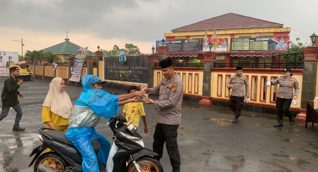 Meskipun sedang di guyur hujan tidak menyurutkan niat Kapolsek Patumbak Kompol Faidir SH, MH dan Kanit Intel AKP Zumailan, Kanit Reskrim Iptu M.Y Dabutar SH, MH, Kanit Lantas Ipda Ellys MM Sitorus SH, MH, Panit I Ipda Eko Priya SH serta Kanit Patroli Ipda Rezeky Tua Pandiangan bersama personel Polsek Patumbak membagi – bagikan makanan takjil berbuka puasa secara gratis kepada warga masyarakat Kec.Patumbak yg sedang melintas di jalan raya tepatnya b di depan Mako Polsek Patumbak pada hari Jumat ,( 07/03/2025 ) sore menjelang berbuka uka puasa.