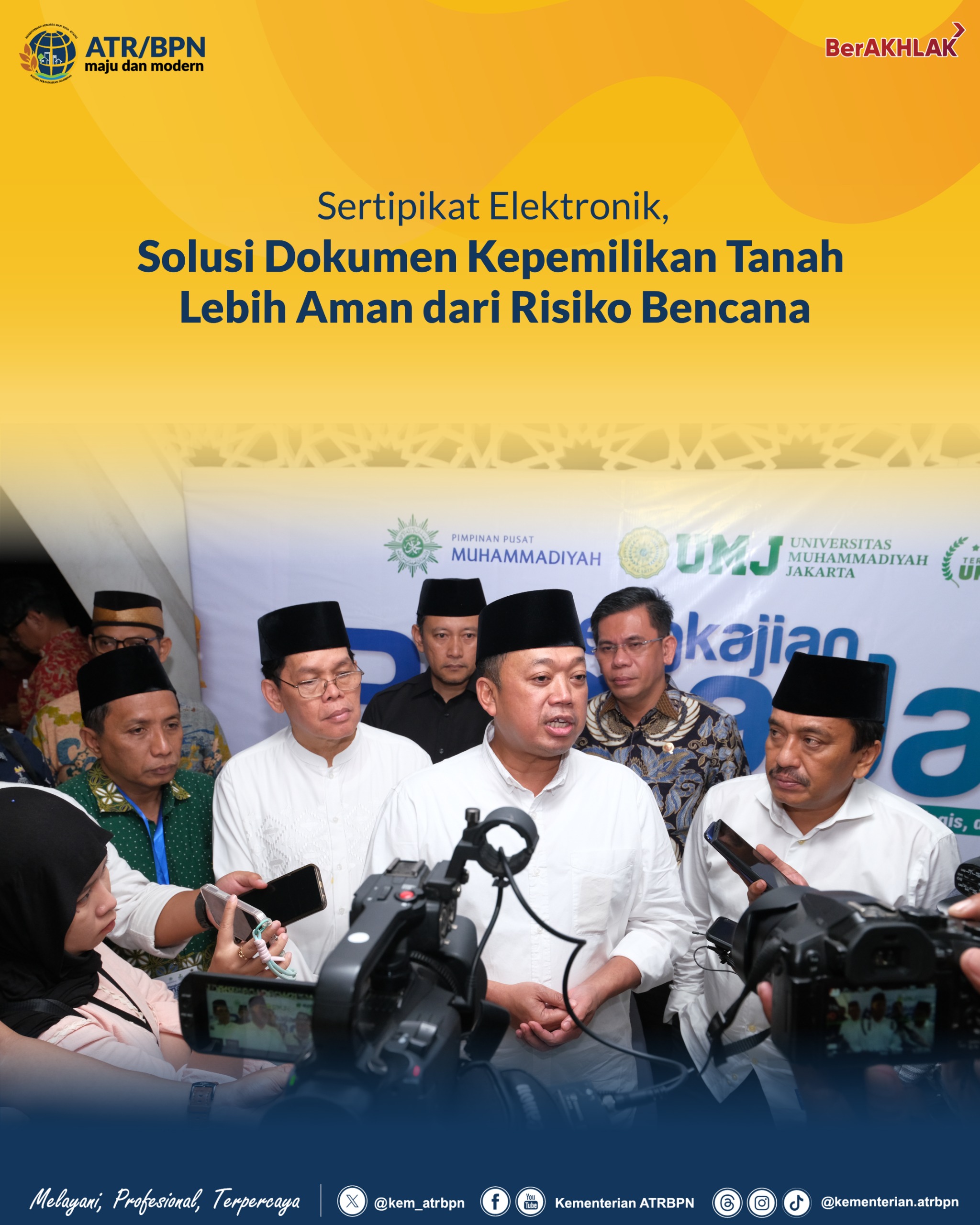 “Harusnya dengan Sertipikat Elektronik, tidak ada kekhawatiran sertipikatnya hanyut atau rusak akibat banjir. Semua tersimpan dalam dunia digital dan hanya pemilik dengan akses yang bisa menggunakannya,” jelas Menteri Nusron saat ditemui usai menghadiri acara Pengkajian Ramadan 1446 H, di Auditorium Universitas Muhammadiyah Jakarta, Tangerang Selatan, Kamis (06/03/2025).