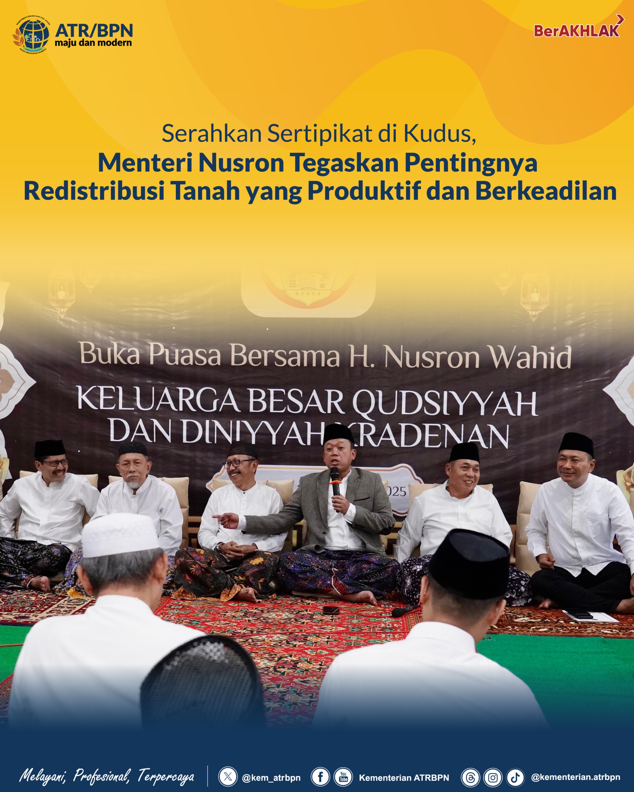 “Isu dalam dunia pertanahan di Indonesia ini adalah isu ketidakadilan. Maka, caranya adalah kita harus melakukan redistribusi (tanah) kepada kekuatan-kekuatan rakyat, namun redistribusi ini harus diimbangi dengan kapasitas dan kualitas yang mumpuni. Jangan sampai tanah yang diserahkan ke masyarakat malah tidak bisa produktif,” ujar Menteri Nusron saat menyerahkan 20 sertipikat tanah wakaf dalam acara Buka Puasa Bersama di Pondok Pesantren Qudsiyyah, Kabupaten Kudus, Jawa Tengah, Sabtu (08/03/2025).