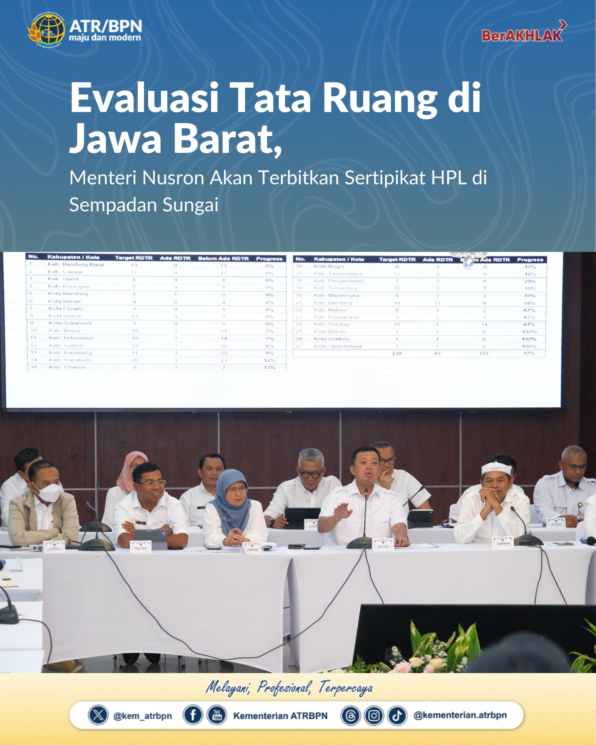 Hadir mendampingi Menteri Nusron, Direktur Jenderal Penetapan Hak dan Pendaftaran Tanah (Dirjen PHPT) Asnaedi; Dirjen Survei dan Pemetaan Pertanahan dan Ruang (SPPR), Virgo Eresta Jaya; Plt. Dirjen Tata Ruang, Reny Windyawati; Kepala Biro Hubungan Masyarakat, Harison Mocodompis; Direktur Bina Perencanaan Daerah Wilayah I, Rahma Julianti; dan Kepala Kantor Wilayah BPN Provinsi Jawa Barat beserta jajaran. (GE/FA)