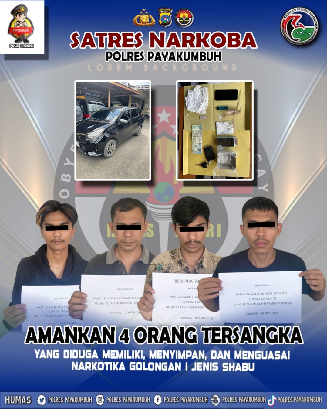 Payakumbuh, CNN Indonesia.id – Tim Phantom Sat Narkoba Polres Payakumbuh berhasil memutus salah satu mata rantai peredaran narkotika jenis sabu dengan meringkus empat orang tersangka beserta barang buktinya.