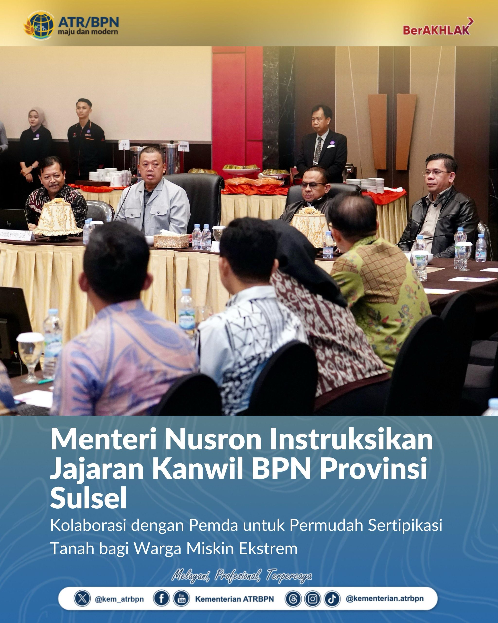Menteri Nusron Instruksikan Jajaran Kanwil BPN Provinsi Sulsel Kolaborasi dengan Pemda untuk Permudah Sertipikasi Tanah bagi Warga Miskin Ekstrem