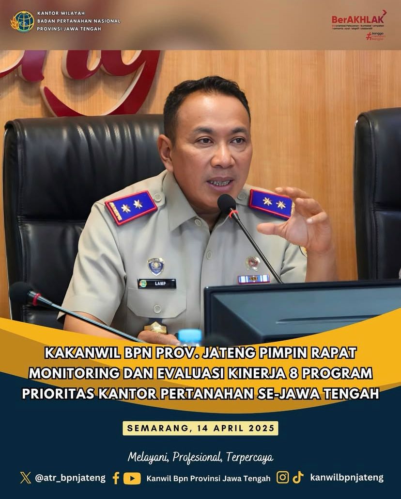 CNNIndonesia.id // Senin, 14 April 2025 — Kantor Wilayah BPN Provinsi Jawa Tengah melaksanakan Rapat Monitoring dan Evaluasi yang dipimpin langsung oleh Kepala Kantor Wilayah, Lampri. Dalam kesempatan tersebut, beliau menyampaikan 8 program prioritas yang telah dicanangkan oleh Menteri ATR/BPN kepada seluruh kepala bidang dan pejabat fungsional. Para pejabat fungsional diharapkan dapat berperan aktif sebagai tim evaluasi, dengan mengisi form kinerja satker setiap hari Jumat sebagai bahan monitoring rutin terhadap capaian kinerja.