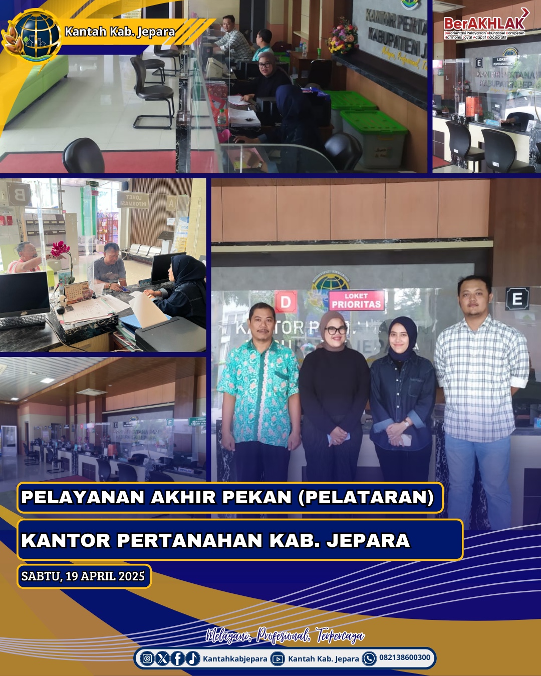 Jepara, CNNIndonesia.id // Sabtu 19 April 2025. Kantor Pertanahan Kabupaten Jepara melaksanakan kegiatan Pelayanan Akhir Pekan (PELATARAN) yang rutin dilaksanakan setiap hari Sabtu dan Minggu mulai pukul 09.00 WIB sampai dengan 12.00 WIB bagi pemohon langsung tanpa kuasa.