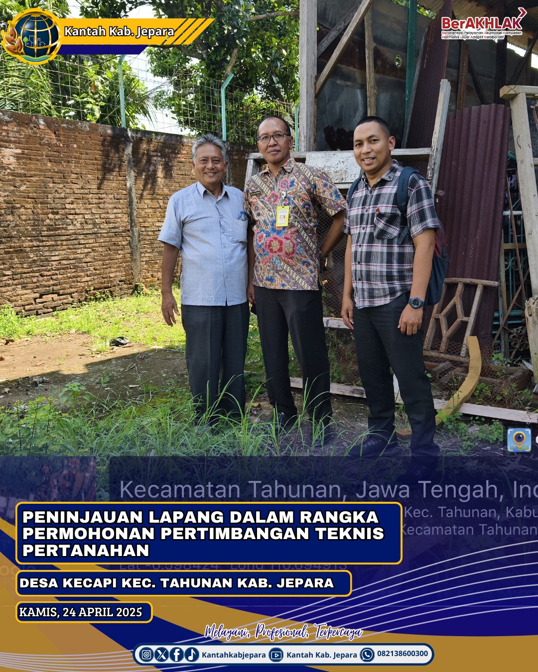 Jepara,CNNIndonesia.id // Kamis 24 April 2025 Setyo Dwi Purnomo selaku Koordinator Kelompok Substansi Penatagunaan Tanah melakukan peninjauan lapangan dalam rangka permohonan pertimbangan teknis pertanahan untuk kegiatan berusaha di Desa Kecapi, Kecamatan Tahunan.