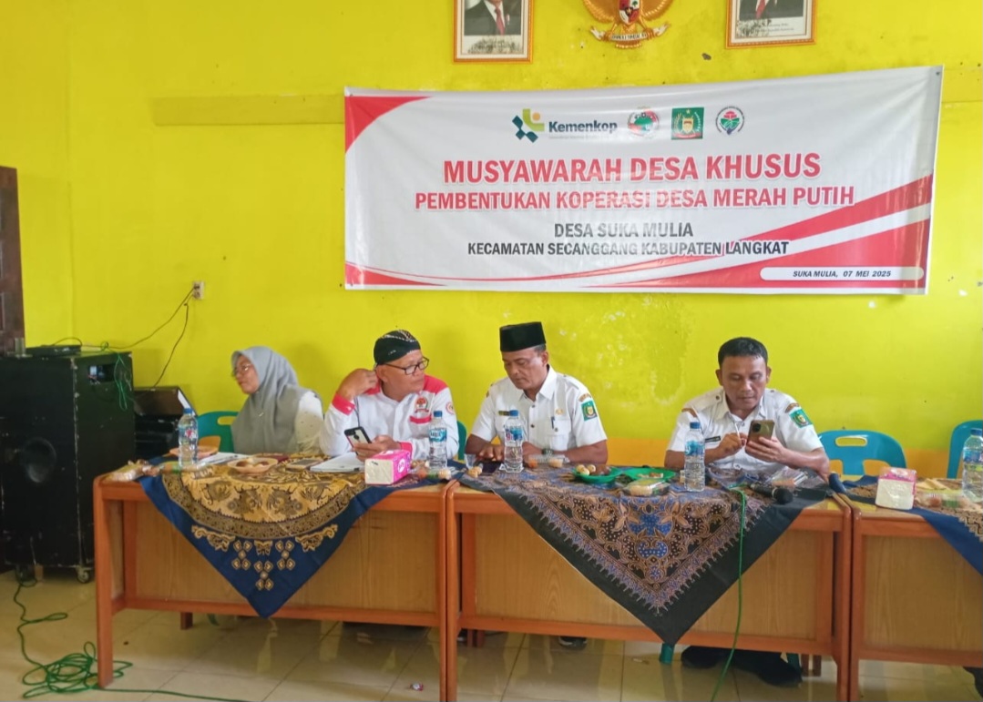 Pembentukan Koperasi Merah Putih ini sudah di atur oleh undang-undang secara menyeluruh se-indonesia di bawah naunganenteri Koperasi Pusat di jakarta, Musyawarah ini di laksanakan pada hari Rabu:7/5/25 mulai pukul 10 00 Wib pagi sampai dengan selesai yang di hadiri oleh Kasi PMP Kecamatan Secanggang Bapak Hidayat, Kepala desa Suka Mulia, Babhinsa, Babhinkamtibmas, Ketua BPD-Ketua LPMD desa Suka Mulia, Pendamping desa, Ibu-ibu PPL, tokoh agama, tokoh masyarakat dan tokoh pemuda desa Suka Mulia.