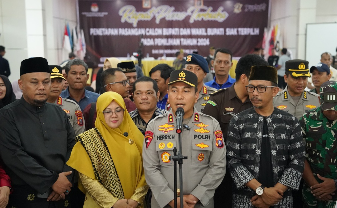 Kapolda Riau Irjen Pol Herry Heryawan menyampaikan apresiasi dan rasa terima kasih atas suksesnya penyelenggaraan rapat pleno penetapan Bupati dan Wakil Bupati Siak terpilih periode 2024–2029. Menurutnya, rangkaian puncak Pilkada Siak ini merupakan bagian penting dari pesta demokrasi yang harus dijalani bersama.