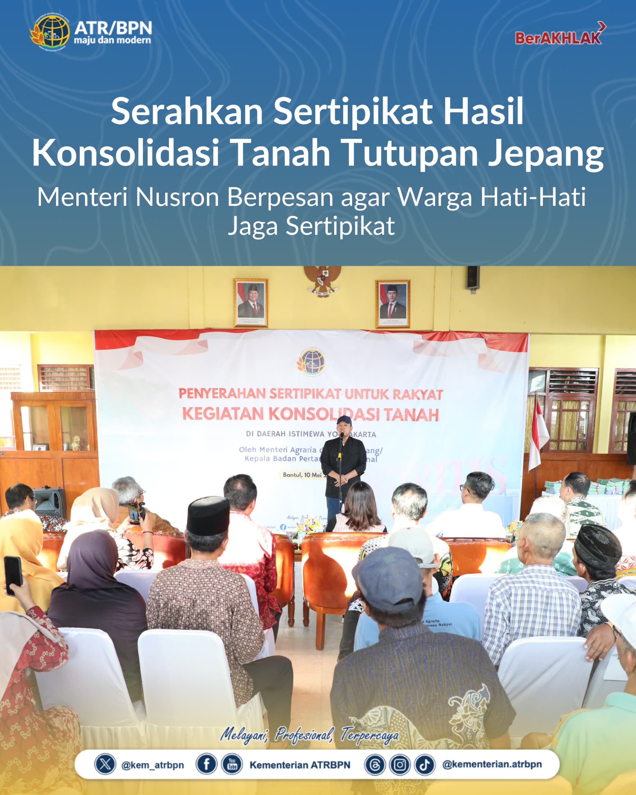 Sleman – Menteri Agraria dan Tata Ruang/Kepala Badan Pertanahan Nasional (ATR/BPN), Nusron Wahid tak henti berpesan agar masyarakat menjaga sertipikat tanahnya dan tak mudah memberikan kepada orang lain untuk mencegah penyalahgunaan sertipikat. Ia menyampaikan pesan itu usai membagikan sertipikat hasil Konsolidasi Tanah untuk Tanah Tutupan Jepang, di Kantor Lurah Parangtritis, Kabupaten Bantul, D.I. Yogyakarta, Sabtu (10/05/2025).