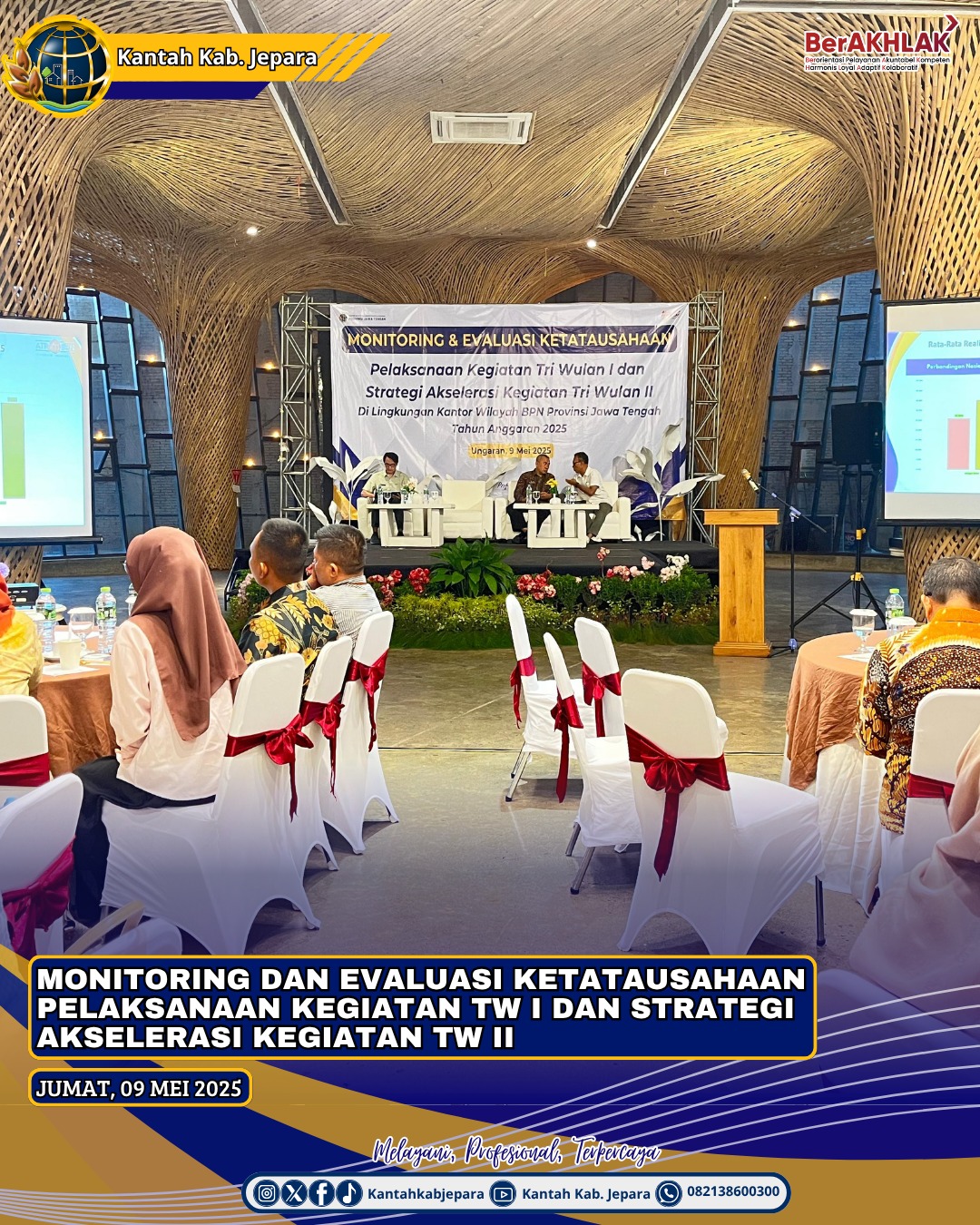 Jepara- CNNIndonesia.id,// Jumat 9 Mei 2025 Kantor Wilayah Badan Pertanahan Nasional Provinsi Jawa Tengah telah melaksanakan Monitoring dan Evaluasi Ketatausahaan Pelaksanaan Kegiatan Triwulan I dan Strategi Akselerasi Kegiatan Triwulan II. Monitoring dan Evaluasi dipimpin oleh Kepala Bagian Tata Usaha, Drs Muchamad Mastur, S.H., M.M didampingi Kepala Sub Bagian Perencanaa Evaluasi dan Pelaporan, Saeful Zafar, S.H.,M.M, Kepala Subbagian Keuangan BMN Galih Rio Pramuindrasto, S.E.,M.M, Kepala Subbagian Hukum Kepegawaian dan Organisasi, Achnad Dimyati,S.H.,M.M yang dihadiri oleh seluruh Kepala Subbagian Tata Usaha beserta staff Kantor Pertanahan Kabupaten dan Kota.