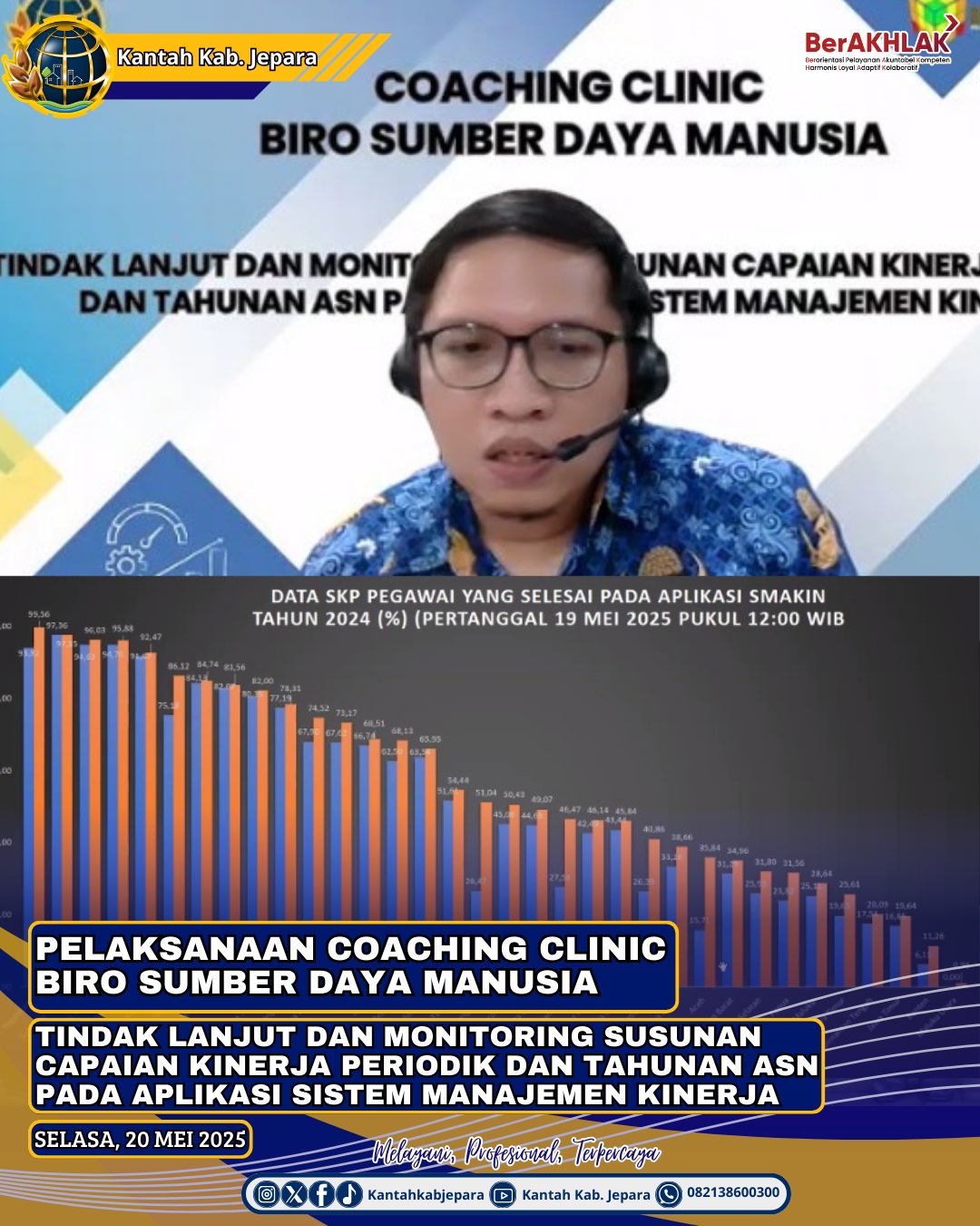 Jepara, 20 Mei 2025 Kantor Pertanahan Kabupaten Jepara pada bagian Sub Kepegawaian mengikuti kegiatan Coaching Clinic terkait tindak lanjut dan monitoring susunan capaian kinerja periodik dan tahunan ASN pada Aplikai Sistem Manajemen Kinerja (SMAKIN) oleh Biro SDM Kementerian ATR/BPN.