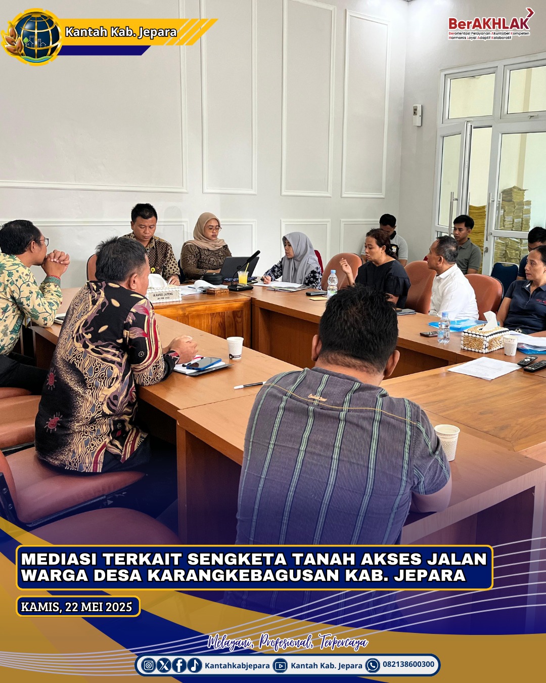 Jepara, Kamis 22 Mei 2025 Seksi Pengendalian dan Penanganan Sengketa yang dipimpin langsung oleh Kepala Seksi PPS Bapak Yuli Fitrianto, S.H.,M.H. dan diampingi oleh Koordinator Kelompok Substansi Pengendalian Pertanahan dan Koordinator Kelompok Subatansi Penanganan Sengketa, Konflik dan Perkara melaksanakan kegiatan Mediasi terkait sengketa tanah akses jalan salah satu warga Desa Karangkebagusan Kecamatan Jepara Kabupaten Jepara di Ruang Mediasi Kantor Pertanahan Kab. Jepara pada hari Kamis 22 Mei 2025.
