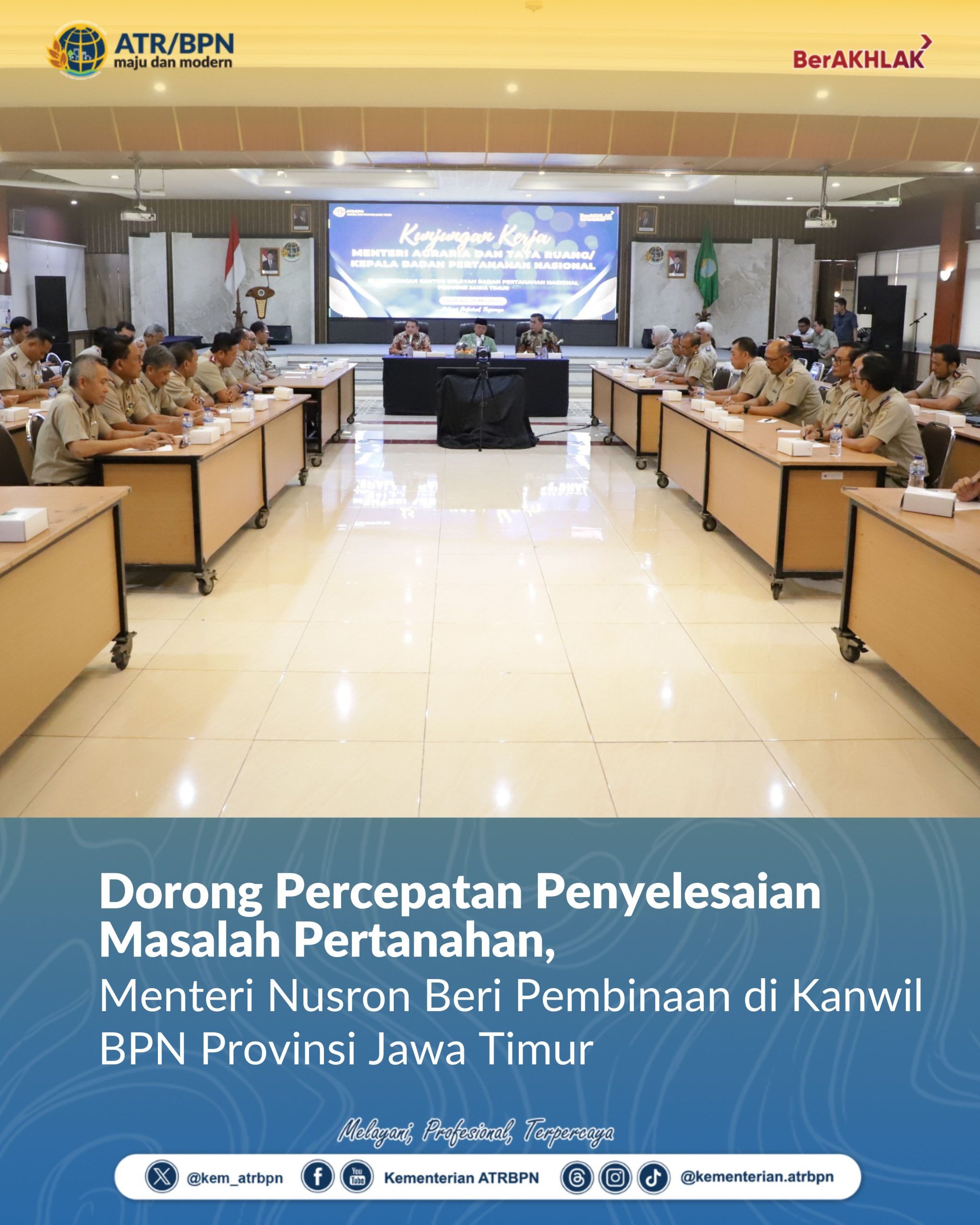 Provinsi Jawa Timur memiliki luas wilayah 4.825.146 hektare dengan Areal Penggunaan Lain (APL) mencapai 3.456.807 hektare atau 71,67% dari total wilayah. Dari jumlah tersebut, 2,6 juta hektare atau 74% telah terdaftar bidang tanahnya. Menanggapi data tersebut, Menteri Nusron menekankan pentingnya perencanaan yang tepat untuk menuntaskan pekerjaan yang tersisa.