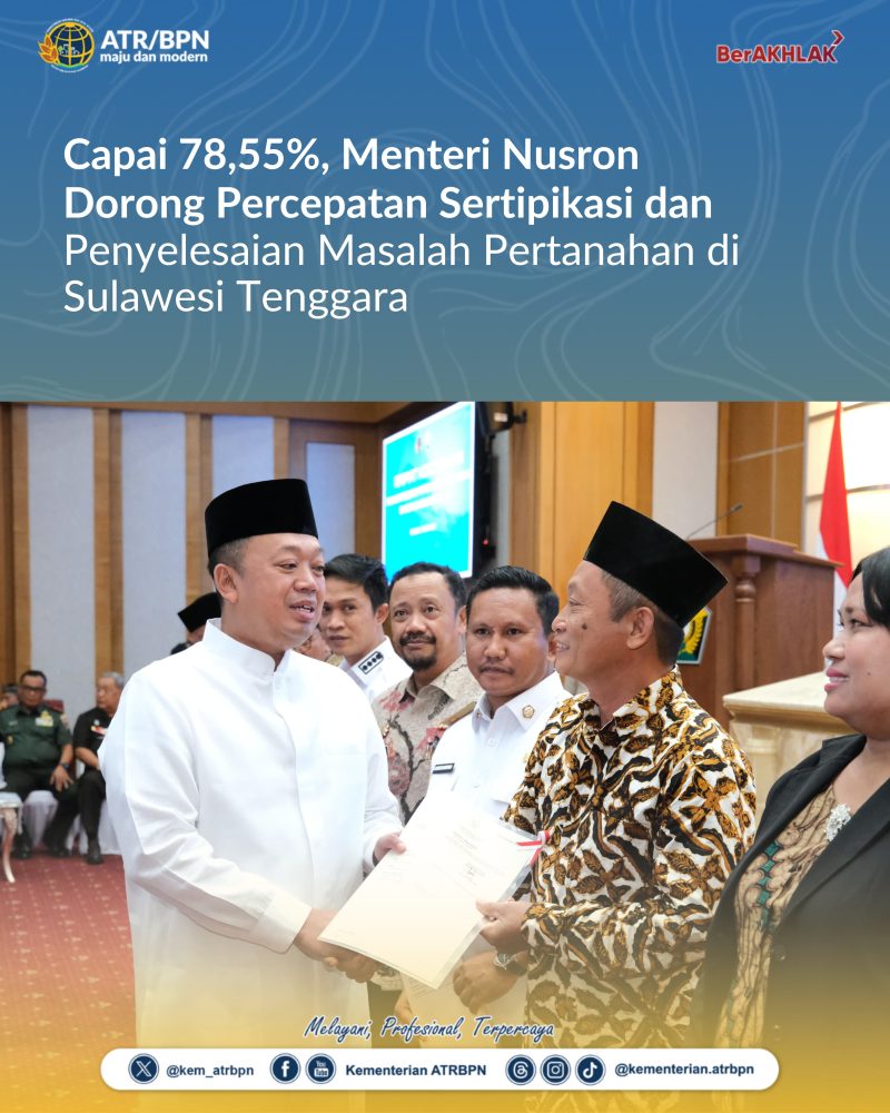 Ia mencontohkan langkah progresif Gubernur Jawa Timur dan Jawa Tengah yang mengeluarkan surat edaran pembebasan BPHTB bagi peserta Pendaftaran Tanah Sistematis Lengkap (PTSL) dari keluarga miskin ekstrem. Menurutnya, kebijakan serupa bisa diterapkan oleh kepala daerah di Sulawesi Tenggara. “Tidak ada salahnya Pak Bupati membebaskan BPHTB warganya supaya tanahnya aman. Dari pada tidak disertipikat dan kemudian bermasalah,” ujar Menteri Nusron.