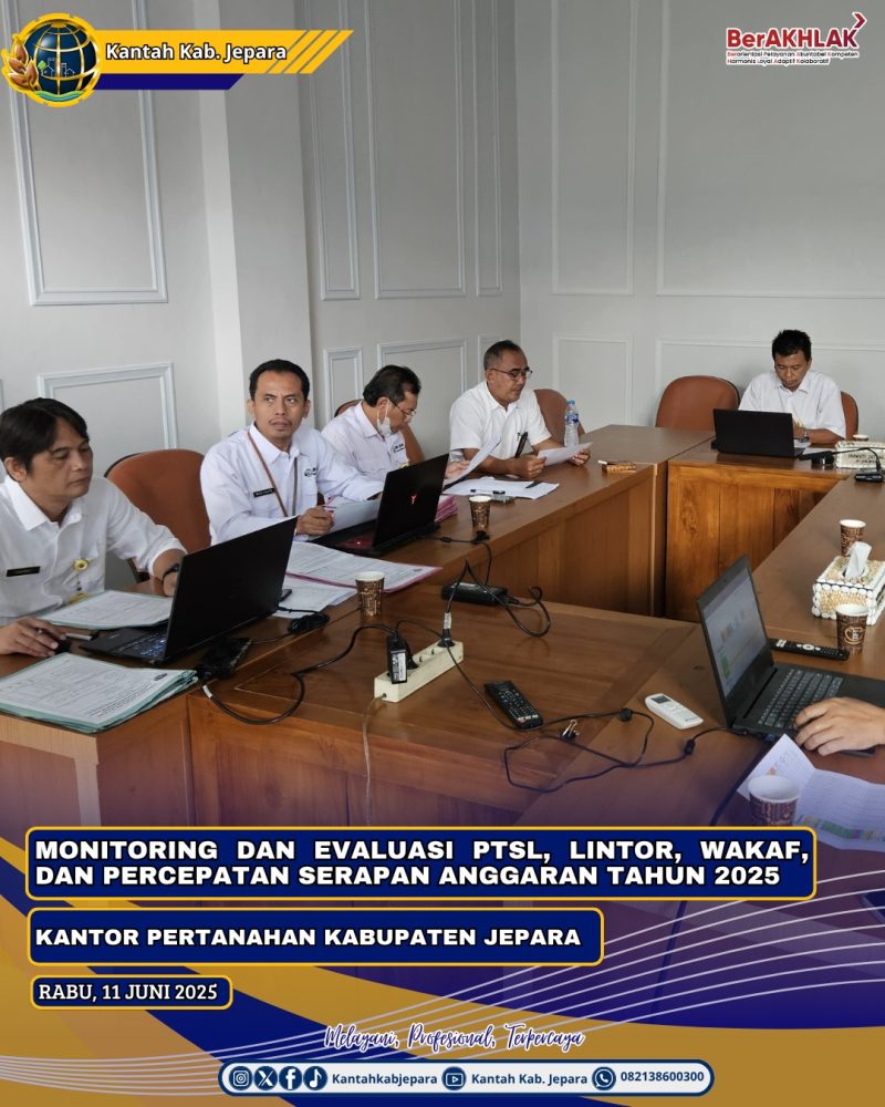 Jepara, CNNIndonesia.id // Rabu 11 Juni 2025 Kepala Koordinator PTSL Kantor Pertanahan Kabupaten Jepara, Yuli Fitrianto, S.H.,M.H. bersama dengan Ketua Tim PTSL, Waka Fisik dan Yuridis, Satgas Fisik dan Yuridis, serta Admin Tim PTSL melaksanakan kegiatan Monitoring dan Evaluasi PTSL, Lintor, Wakaf dan Percepatan serapan anggaran Tahun 2025 di Kantor Pertanahan Kabupaten Jepara.
