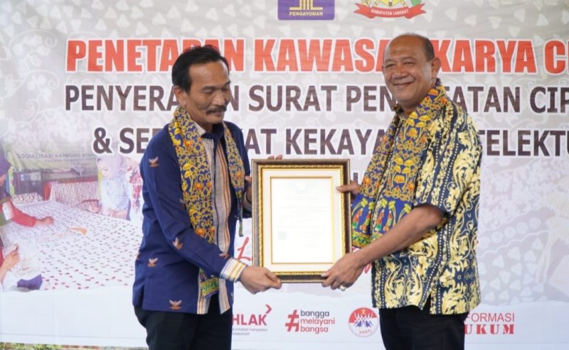 Dalam momen tersebut, Kepala Kanwil Kemenkumham Sumut, Ignatius Mangantar Tua Silalahi, menyerahkan sejumlah dokumen penting kepada Bupati Langkat, termasuk sertifikat KIK untuk kuliner tradisional halua, seni tari Inai, dan piagam penetapan Kampung Batik Brandan sebagai kawasan Karya Cipta. Sertifikat pencatatan ciptaan juga diberikan kepada owner Batik Brandan, Ibu Dhany Rose, atas desain batik khas Langkat bermotif “Mahkota Diraja.”