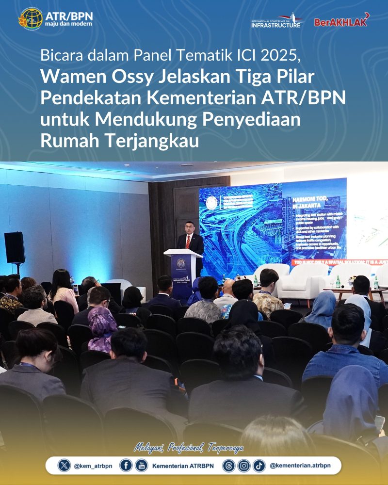 Jakarta – CNNIndonesia.id //  Wakil Menteri Agraria dan Tata Ruang/Wakil Kepala Badan Pertanahan Nasional (Wamen ATR/Waka BPN), Ossy Dermawan, didaulat menjadi pembicara kunci Panel Tematik “Homes Within Reach: Pathing Our Way to Affordable, Connected Urban Living” dalam rangkaian International Conference on Infrastructure (ICI) 2025, Kamis (12/06/2025). Sejalan dengan tema tersebut, ia memaparkan tiga pilar utama pendekatan strategis Kementerian ATR/BPN dalam mendukung penyediaan rumah terjangkau.