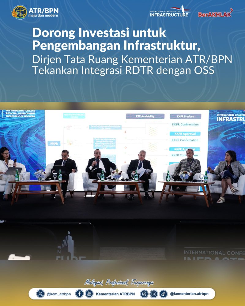 Jakarta – CNNIndonesia.id // Direktur Jenderal (Dirjen) Tata Ruang Kementerian Agraria dan Tata Ruang/Badan Pertanahan Nasional (ATR/BPN), Suyus Windayana, menjadi pembicara pada forum tematik Infrastructure Investment Process in Indonesia yang digelar dalam rangkaian International Conference on Infrastructure (ICI) 2025, Rabu (11/06/2025). Dalam paparannya, ia menegaskan percepatan penyusunan dan integrasi Rencana Detail Tata Ruang (RDTR) dengan sistem Online Single Submission (OSS) menjadi kunci untuk menarik investasi infrastruktur di Indonesia.