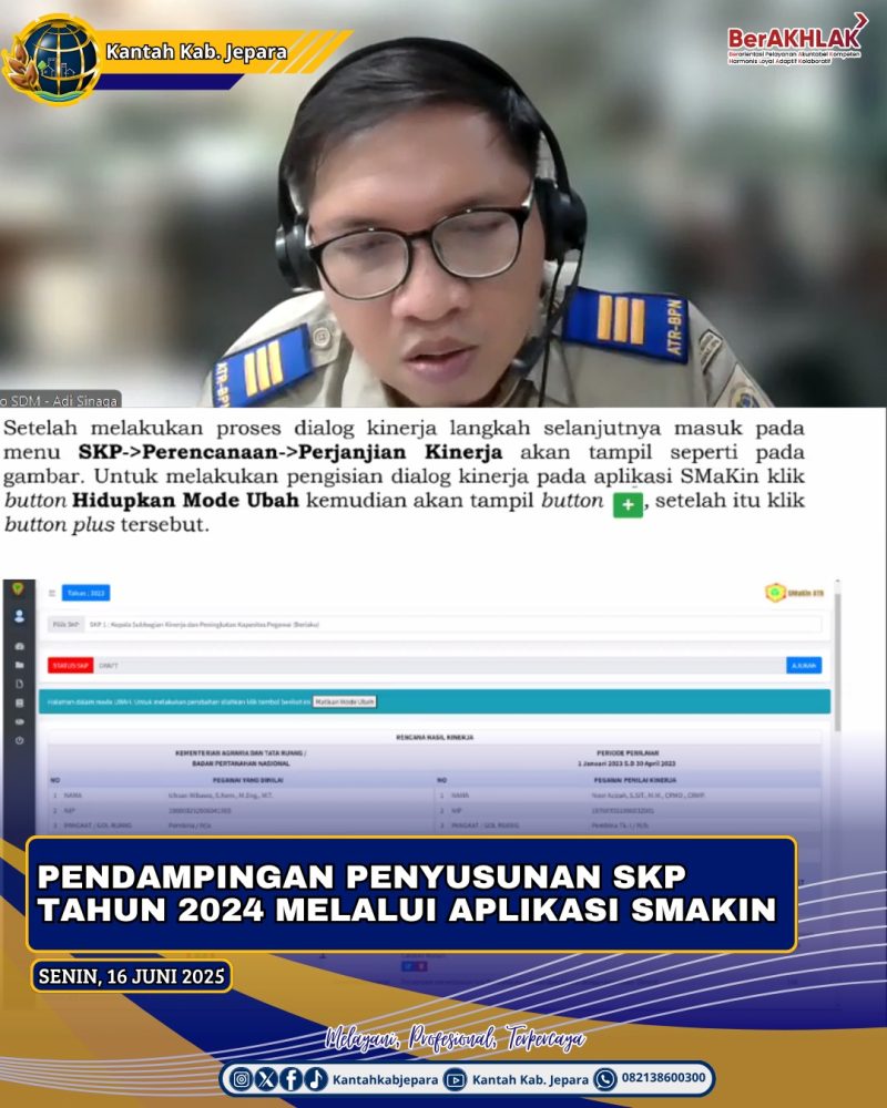 CNNIndonesia.id // Senin, 16 Juni 2025 Biro SDM Kementerian ATR/BPN bersama Kantor Wilayah Badan Pertanahan Nasional Provinsi Jawa Tengah melaksanakan pendampingan penyusunan SKP Tahun 2024 melalui aplikasi SMAKIN. Kegiatan pendampingan tersebut dilakukan secara terjadwal untuk tiap-tiap provinsi, dan diikuti oleh seluruh Kantor Pertanahan Kabupaten dan Kota secara daring pada hari Senin 16 Juni 2025.