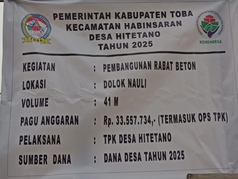 Toba, Sumut, CNN Indonesai.id – Pemasangan Rabat beton Desa Hitetano kecamatan Habinsaran kabupaten Toba dilaksanakan hari pertama Rabu,02.10. 2025,di dusun Dolok Nauli desa Hitetano kecamatan Habinsaran kabupaten Toba.