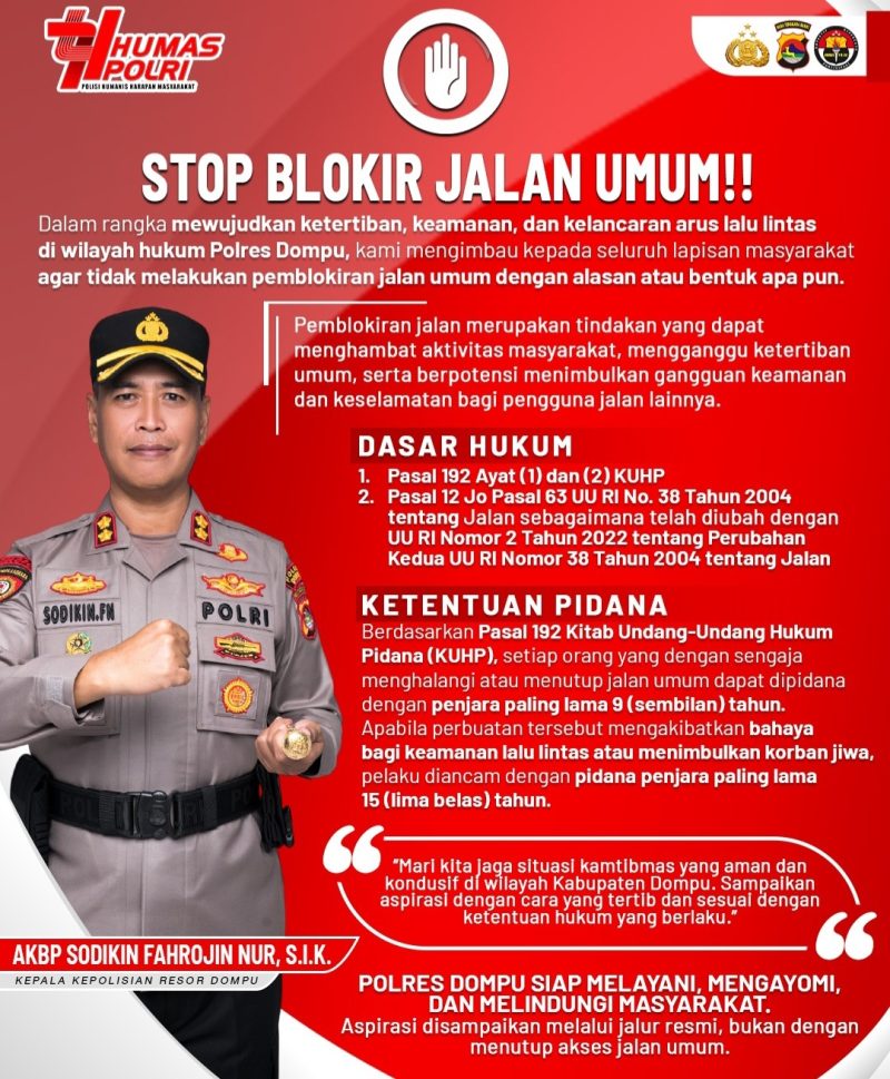 Dompu, NTB, CNN Indonesia.id – Kepala Kepolisian Daerah Nusa Tenggara Barat (Polda NTB) melalui Kepala Kepolisian Resor Dompu menegaskan bahwa aksi pemblokiran jalan umum dalam bentuk apa pun tidak dapat dibenarkan secara hukum. Aksi tersebut dinilai meresahkan masyarakat dan berpotensi menimbulkan gangguan keamanan dan ketertiban masyarakat (kamtibmas).