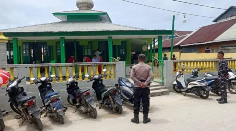 Personel gabungan Polri dan TNI yang tergabung dalam Operasi Lilin Salawaku 2025 melaksanakan pengamanan ibadah Sholat Jumat di Masjid Al Muhajirin, Kecamatan Tanimbar Utara, Kabupaten Kepulauan Tanimbar, Jumat (26/12/2025).