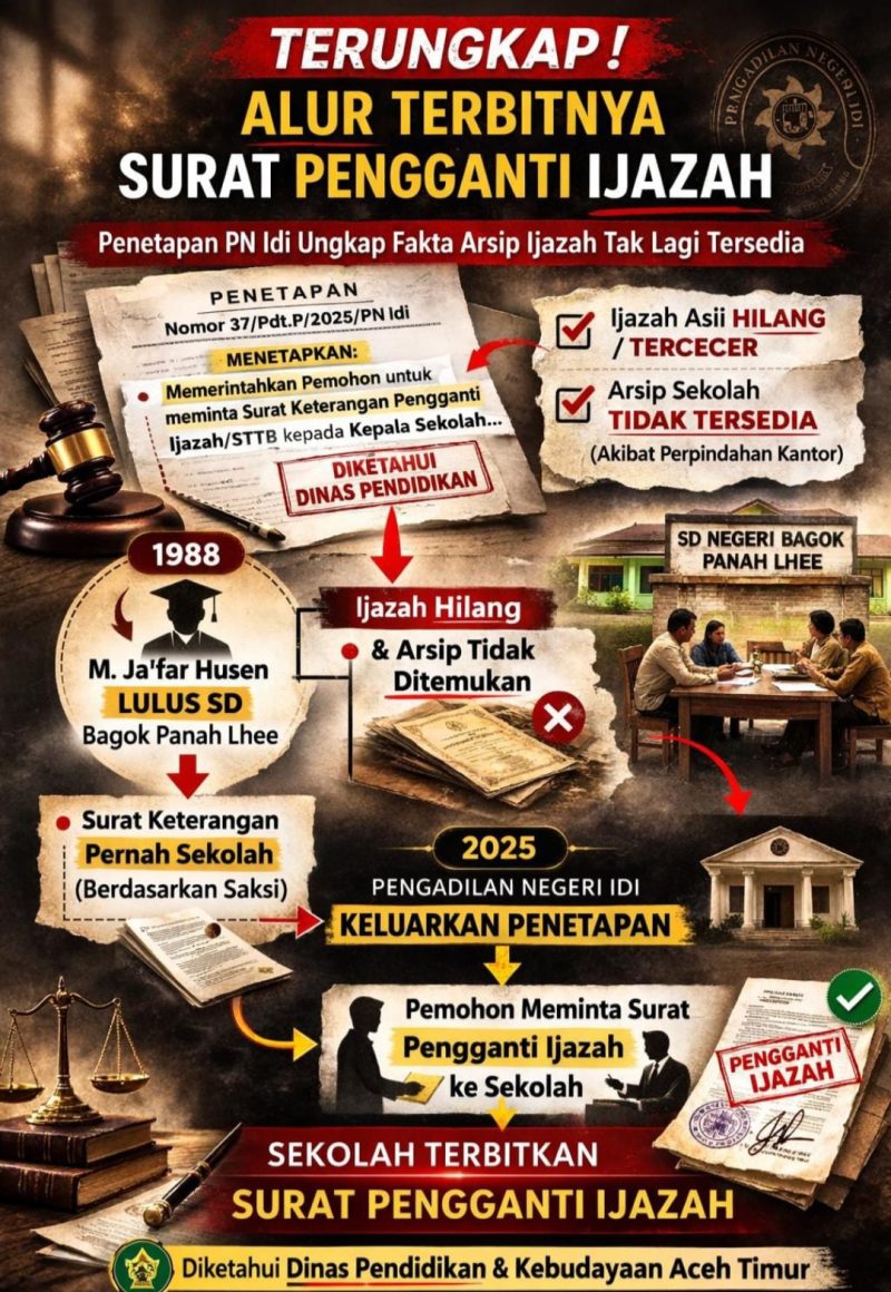 2 Maret 2026, Penetapan Pengadilan Negeri Idi Nomor 37/Pdt.P/2025/PN Idi menjadi dasar penerbitan Surat Keterangan Pengganti Ijazah atas nama M. Jafar Husen. Dalam dokumen penetapan tersebut, terungkap bahwa arsip ijazah di sekolah tidak lagi tersedia, sementara ijazah asli dinyatakan hilang atau tercecer.