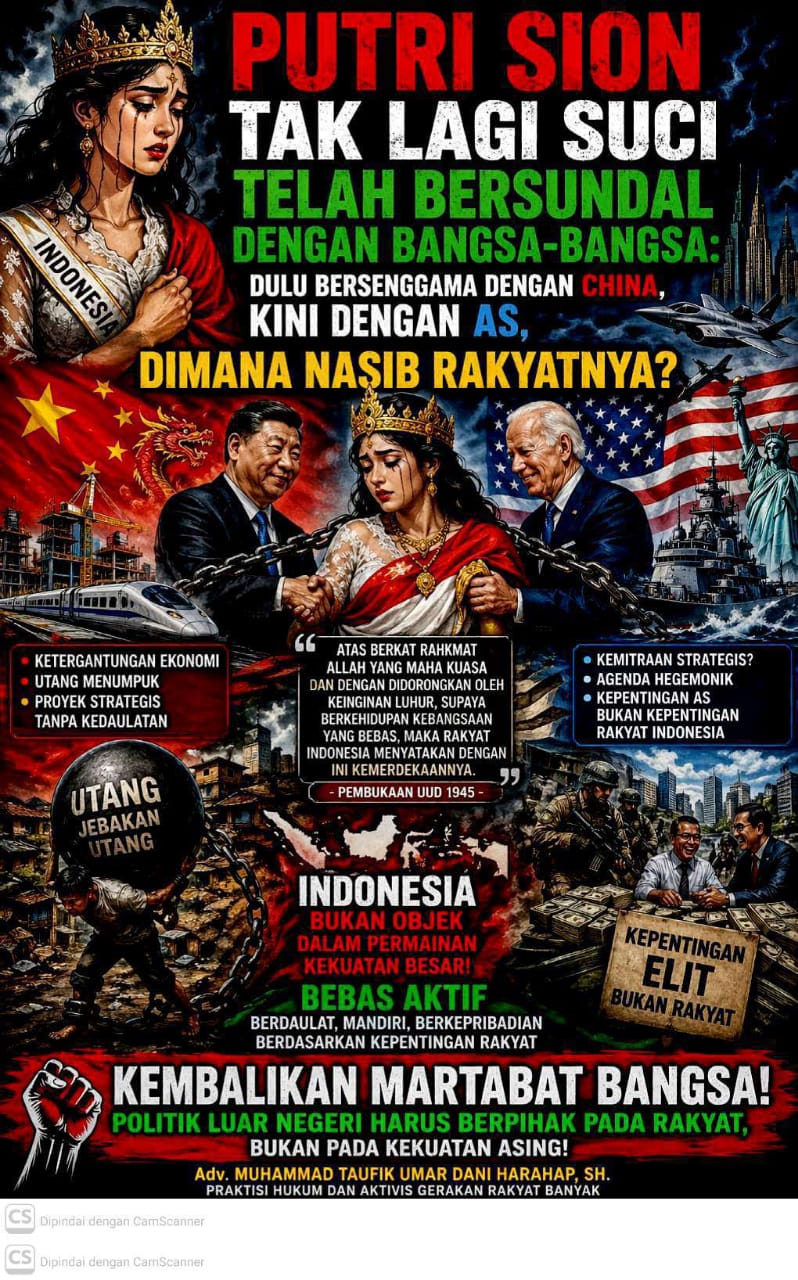 Perubahan arah politik luar negeri Indonesia hari ini tidak lagi sekadar mencerminkan fleksibilitas diplomasi, melainkan mengindikasikan krisis konsistensi yang menyentuh inti jati diri bangsa sebagaimana ditegaskan dalam Pembukaan UUD 1945—bahwa kemerdekaan diraih “Atas berkat rakhmat Allah Yang Maha Kuasa dan dengan didorongkan oleh keinginan luhur, supaya berkehidupan kebangsaan yang bebas, maka rakyat Indonesia menyatakan dengan ini kemerdekaannya”, sebuah mandat moral yang semestinya melahirkan sikap negara yang berdaulat, teguh, dan tidak mudah bergeser oleh tekanan eksternal. Dalam kerangka itu, metafora “Putri Sion” berubah dari simbol kemuliaan menjadi cermin kegamangan: bangsa yang seharusnya berdiri di atas prinsip bebas aktif justru tampak terombang-ambing di antara kepentingan global, dari kedekatan struktural dengan China yang melahirkan ketergantungan ekonomi dan problem laten utang serta kedaulatan proyek, lalu berbelok cepat ke orbit Amerika Serikat dengan narasi kemitraan strategis yang belum tentu bebas dari agenda hegemonik.